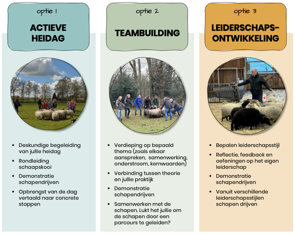 We hebben drie boeiende opties samengesteld die jouw heidag of teamontwikkeling versterken. Maatwerk is natuurlijk mogelijk, want we begrijpen dat geen enkel team of groep hetzelfde is. Waar de programma’s gelijk in zijn is dat het jullie als team of groep in beweging brengt, letterlijk en figuurlijk. Samen gaan we werken met de schapen en leggen de verbinding met jullie werkthema’s en specifieke uitdagingen. Lukt het jullie om de schapen door een parcours te geleiden? En lukt het jou om de hond met de juiste commando’s en lichaamstaal aan te sturen?