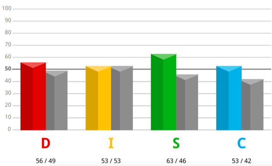 Onderstaand zie je het gedragsprofiel van Linda. Daar waar doorgaans één of meerdere gedragsstijlen hoog zijn (>70 score) of juist laag (<30 score), zie je bij Linda geen hoge of lage scores. We zien bij het natuurlijk gedrag (gekleurde staven) en bij het aangepaste gedrag (grijze staven) een strak profiel. Dat wil zeggen dat alle scores rond de energielijn, oftewel de 50-lijn, liggen. Hoe kan dit en wat zegt dit?